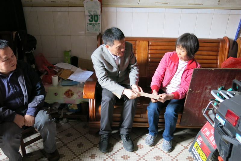 中心慰问人员到达扶涌村委会后,与扶涌村委干部进行了座谈。扶涌村党工委书记、主任陈日新介绍了扶涌村过去一年在集体经济发展、基础设施建设、打造水乡特色村及扶贫脱困方面的有关情况。过去的一年,扶涌村剩余的4户有正常劳动能力的低保户中,已有1户在中心的帮助下实现脱贫。王海明主任回顾了过去一年与扶涌村的结队帮扶情况,对扶涌村未来的发展给予了良好祝愿。随后,慰问队伍分成两组,在扶涌村委的带领下,逐一走访了低保户,与低保家庭成员进行座谈,了解他们的生活近况,送上了粮、油等慰问品与慰问金,并鼓励相关家庭坚定信心、克服困难、充满希望。